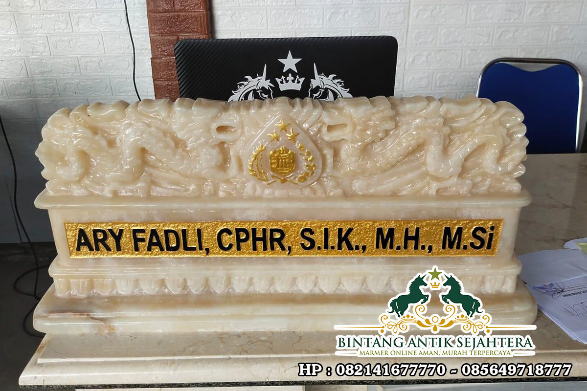 Papan Nama Ukir Onyx – Papan Nama Meja adalah salah satu produk hasil karya UD. Bintang Antik Sejahtera yang biasanya dicari oleh para pimpinan perusahaan atau pejabat. Papan Nama Pejabat yang kami produksi ini berkualitas premium. Telah banyak model papan nama meja yang kami produksi dengan berbagai macam model, bahan dan variasi.